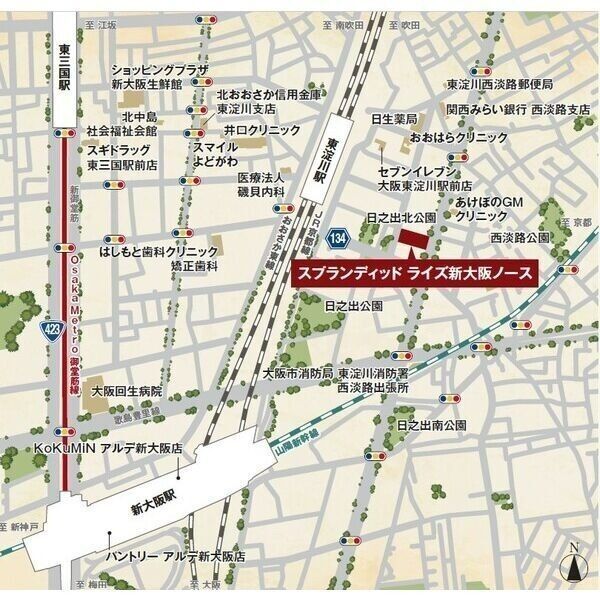 「スプランディッドライズ新大阪ノース」より 東海道線「東淀川」徒歩4分 東海道線「新大阪」徒歩8分 阪急京都線「淡路」徒歩18分 |